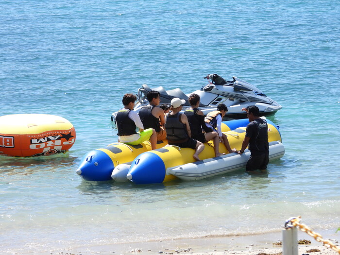 ムルク浜ビーチで飛んだ後は バナナボートに乗って浜比嘉島をぐる〜っと一周しましょう。